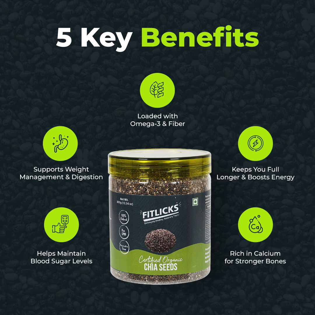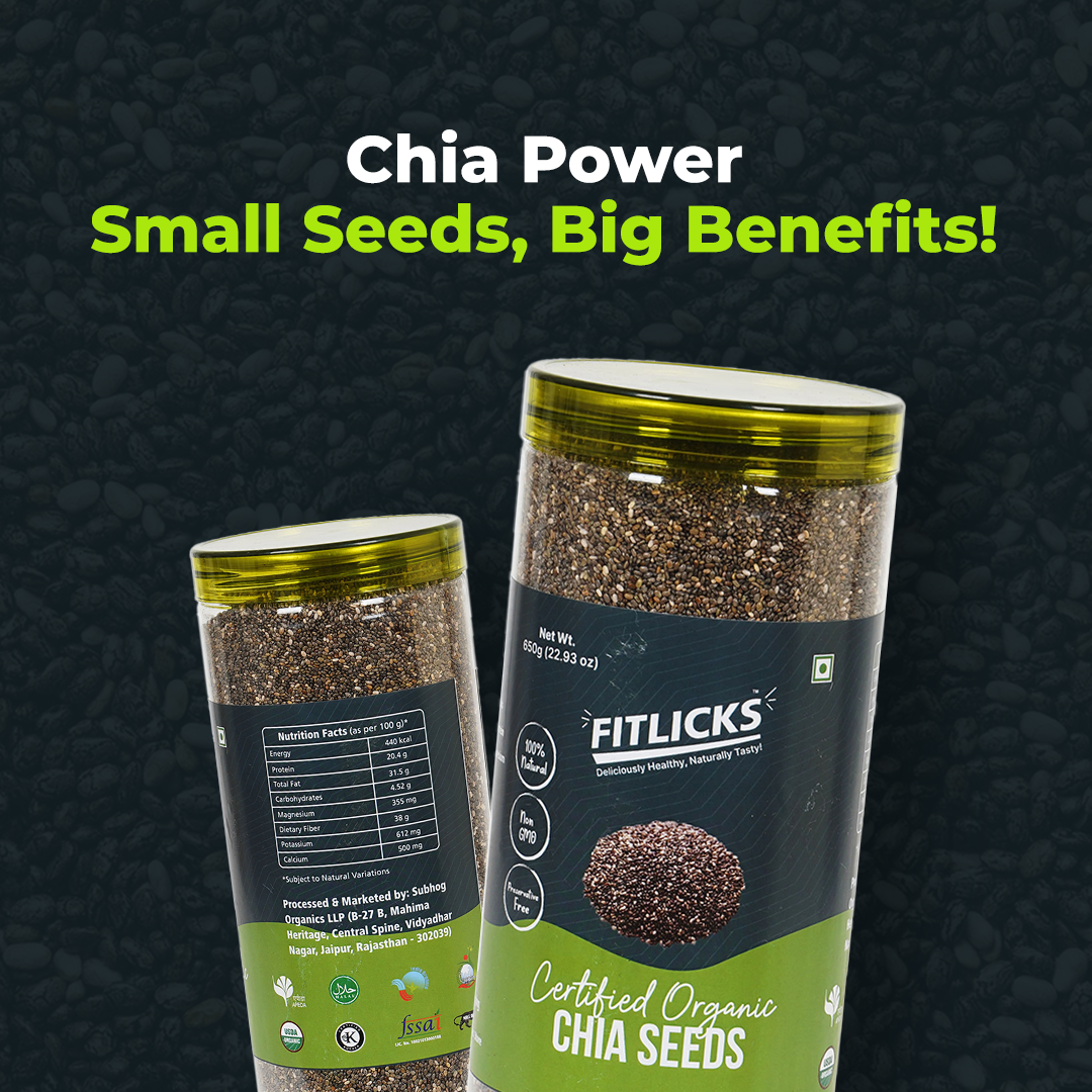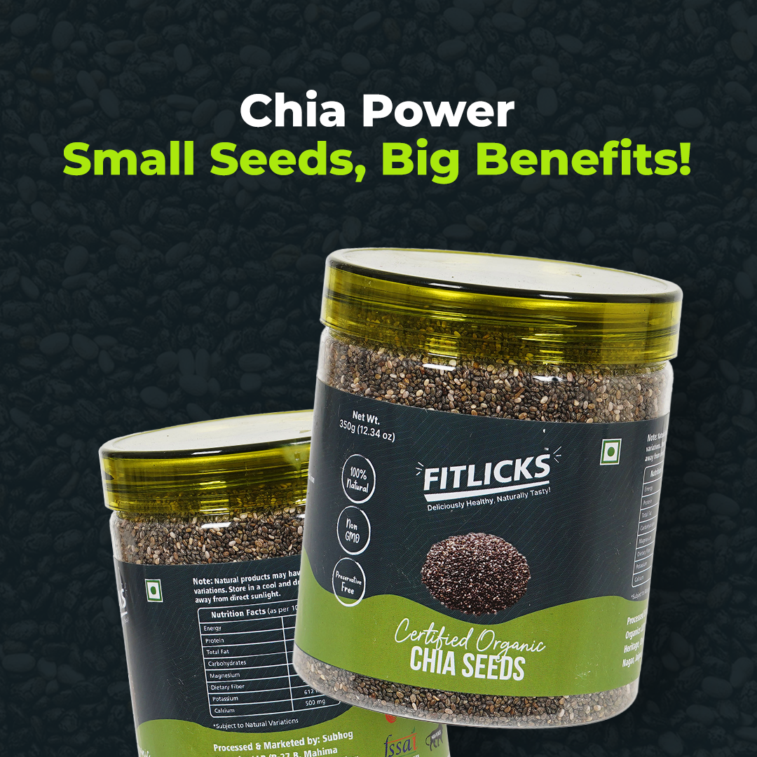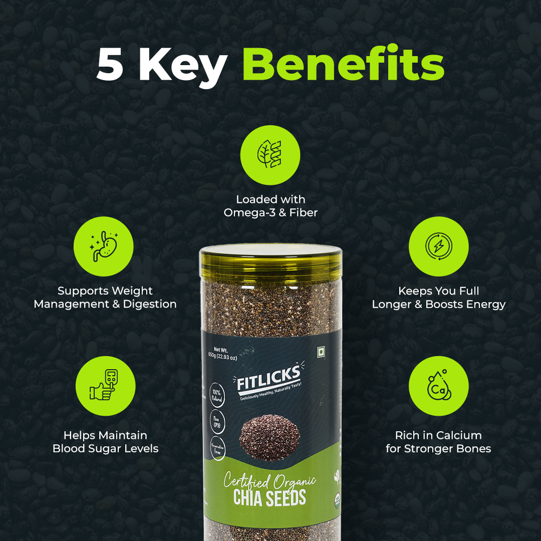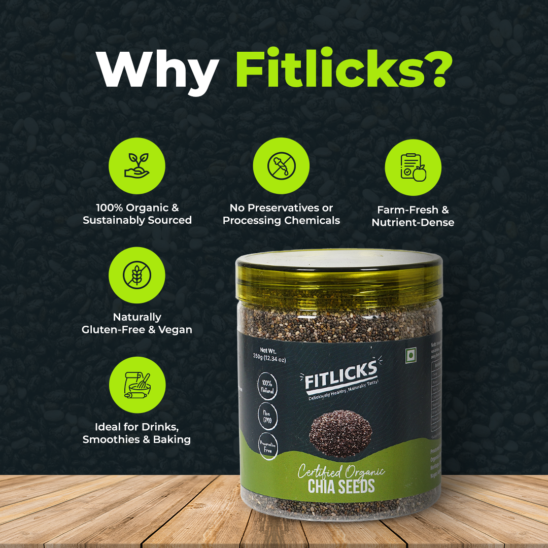 Fuel your body with the pure goodness of Fitlicks Certified Organic Chia Seeds! Packed with Omega-3, fiber, protein and antioxidants, these tiny super seeds support digestion, heart health and sustained energy. Whether you soak, blend, sprinkle or bake, they add a nutritious boost to every meal. Elevate your wellness journey—one seed at a time!